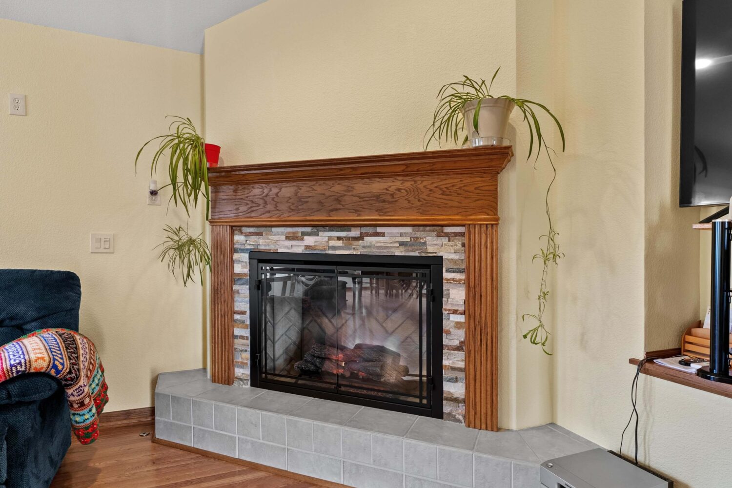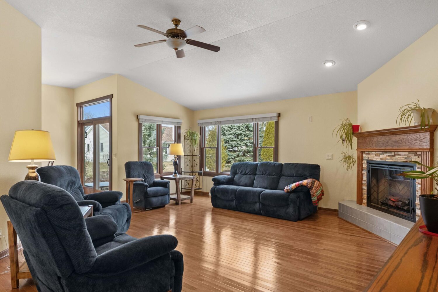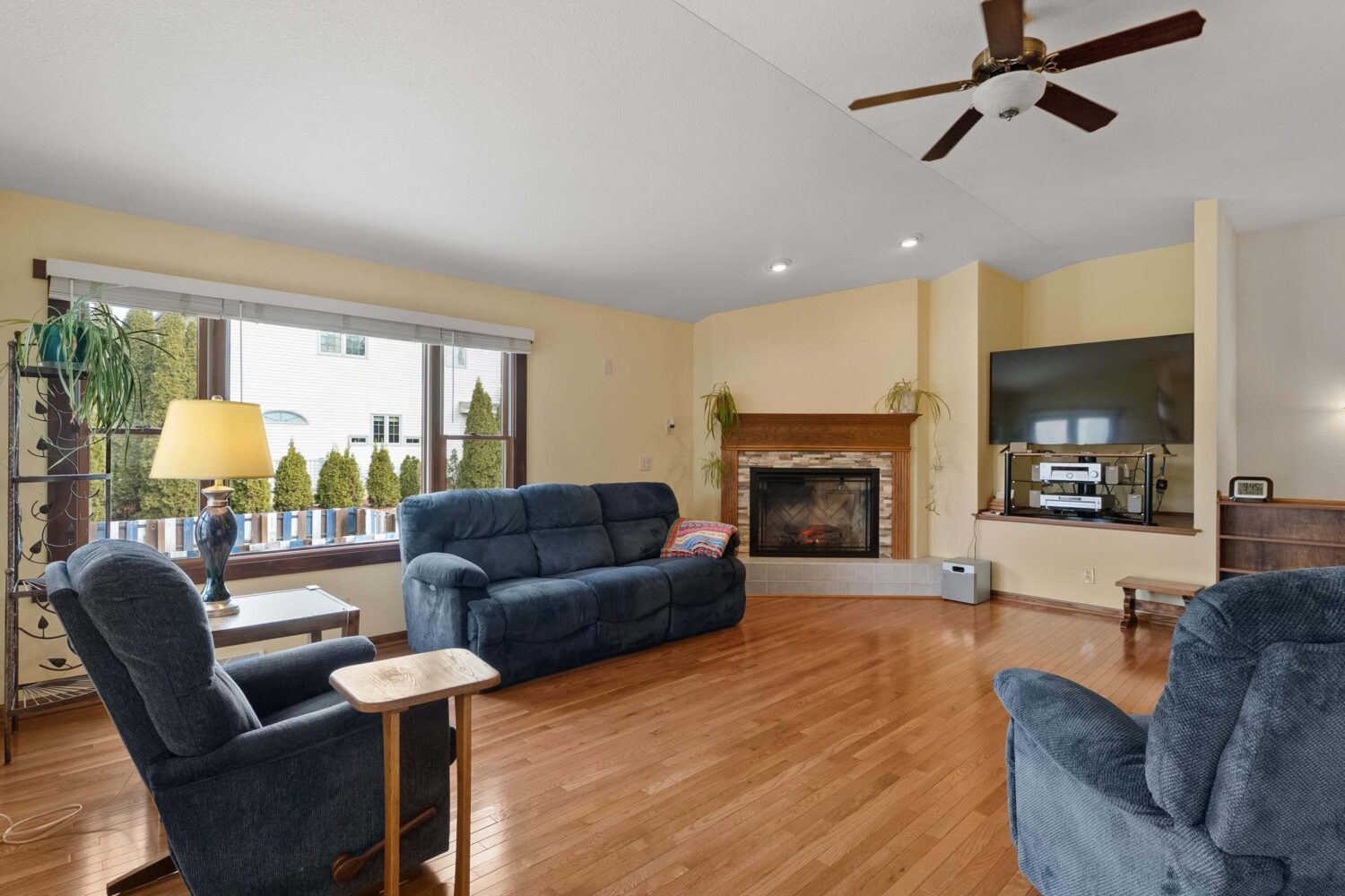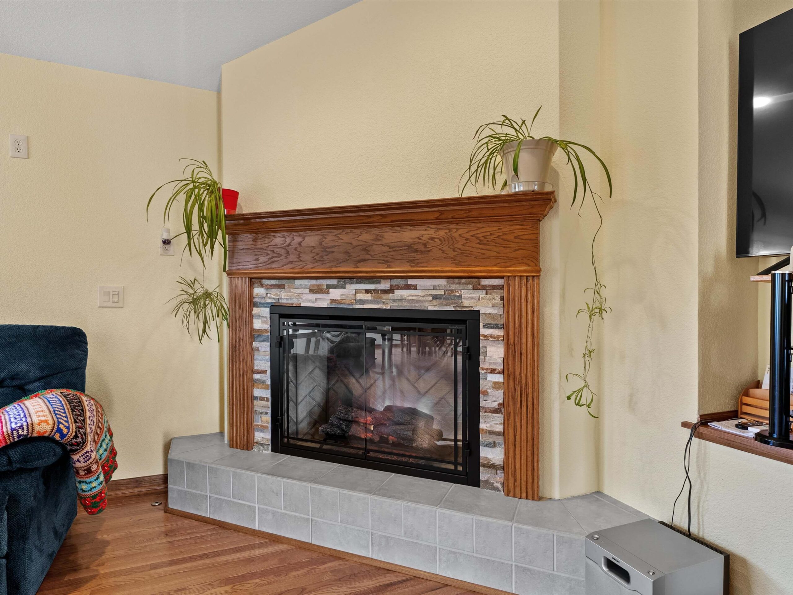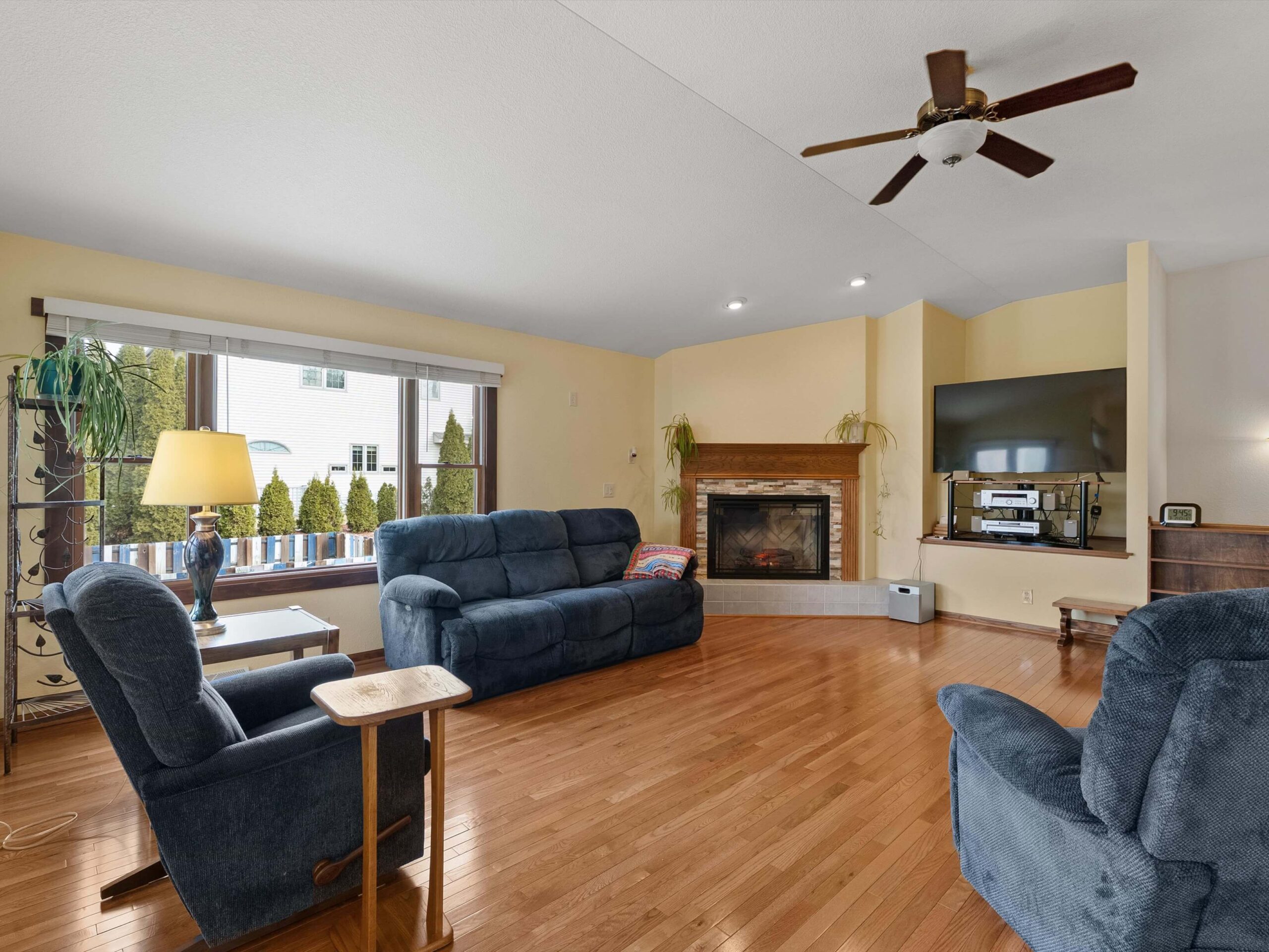 Bright, open, and thoughtfully designed, this well-maintained condo offers comfortable living with a spacious open-concept layout. The living room and dining area feature vaulted ceilings, large windows, and abundant natural light that fills the home throughout the day. A beautiful fireplace with custom tile surround and mantel creates a warm focal point, while hardwood floors add character and continuity through much of the home.