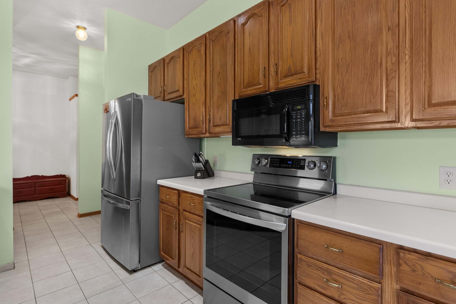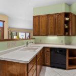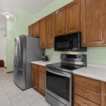 The kitchen provides excellent functionality with abundant cabinetry, convenient pull-out shelves, and under-cabinet lighting for added workspace visibility. Appliances including the refrigerator, oven/range, dishwasher, and garbage disposal are included.