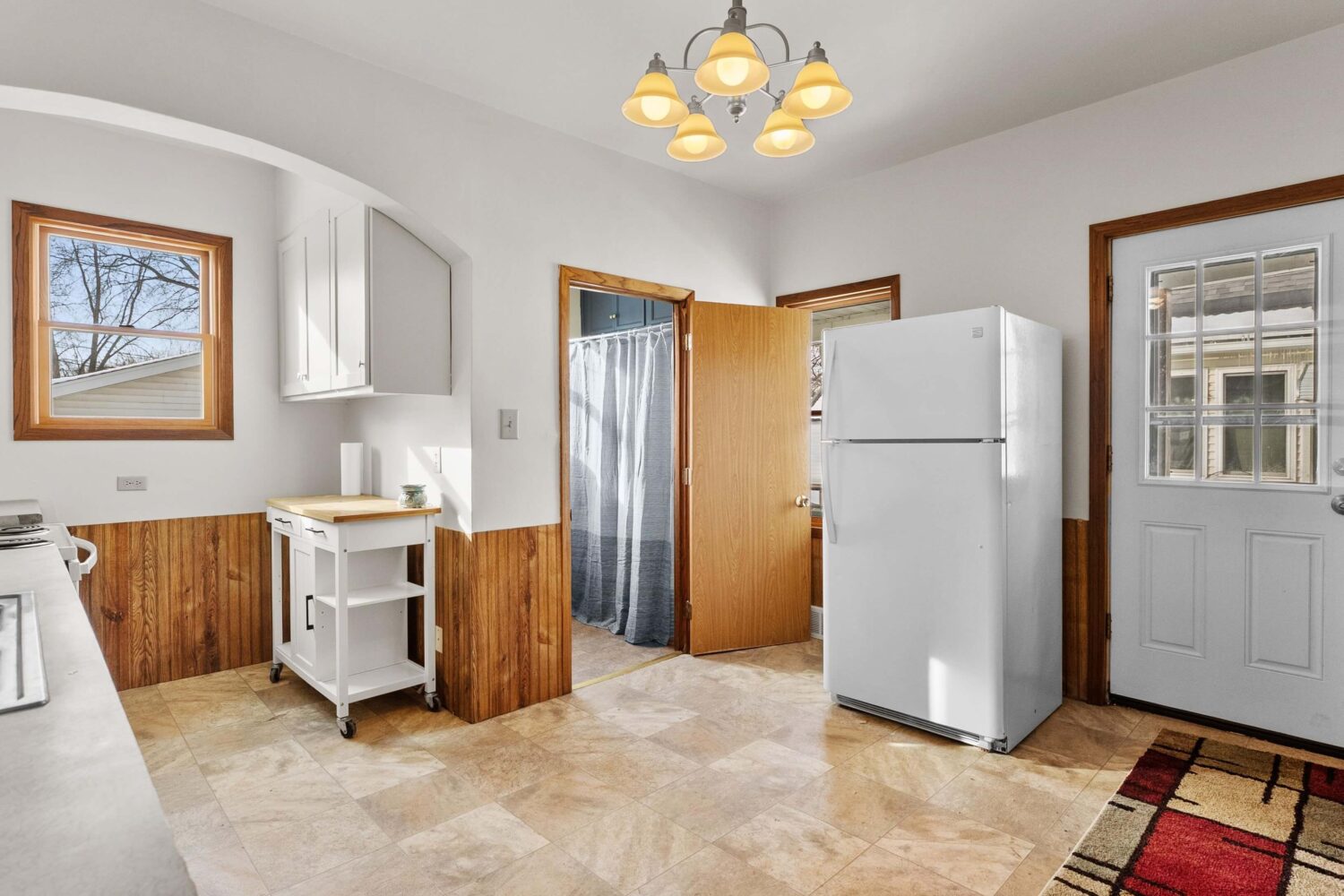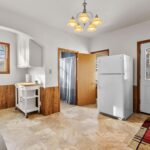 The dining room leads into the kitchen, which offers space for a small table and chairs, abundant cabinetry, and a long walk-in pantry for additional storage. A full bathroom completes the main level.