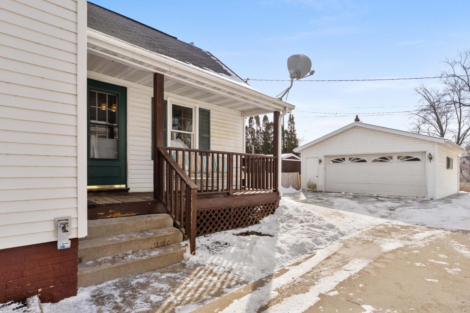 Enjoy the outdoors from the rear second porch. The shared driveway leads to a detached 2-car garage, off-street parking, and a fenced dog run.