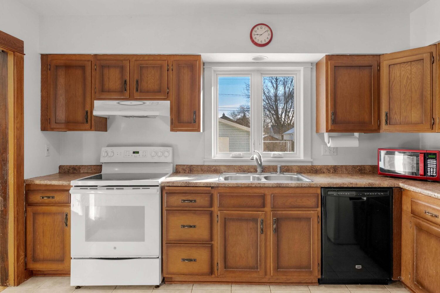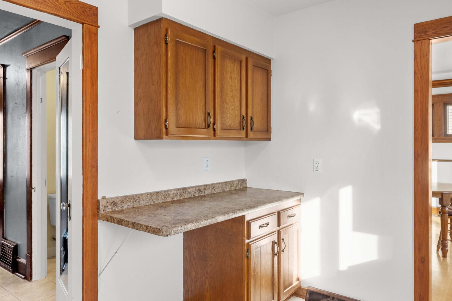 The dining room is highlighted by built-in display hutches, adding both charm and functional storage, while large windows throughout the main living spaces fill the home with natural daylight. The spacious kitchen offers ample room for cooking, gathering, and future updates, complemented by a convenient half bath on the main level.