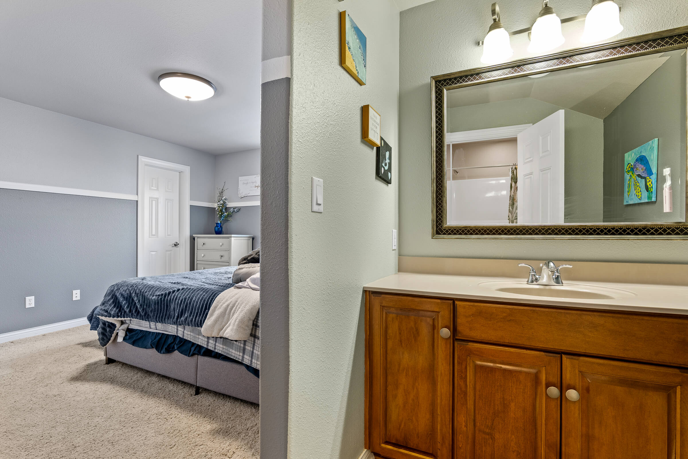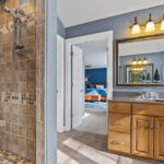 All four bedrooms are located on the upper level, creating a private and cohesive sleeping retreat. The primary suite is a true sanctuary with his and hers walk in closets and a spa inspired bathroom. One additional bedroom features its own en suite bathroom, perfect for guests or multi generational living. The remaining two bedrooms are connected by a well designed Jack & Jill bathroom, each with their own private vanity space, offering both functionality and privacy. Every bedroom includes a large walk in closet, and the home is filled with abundant storage throughout, making organization effortless.