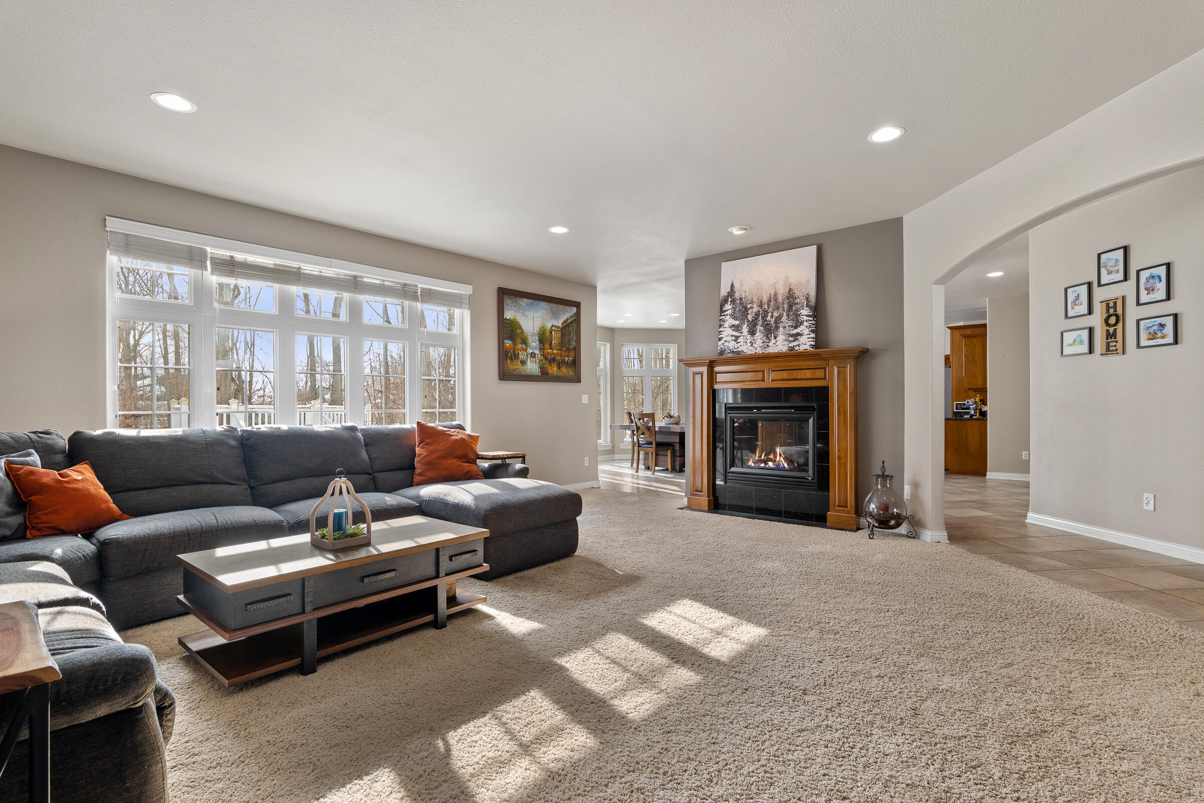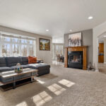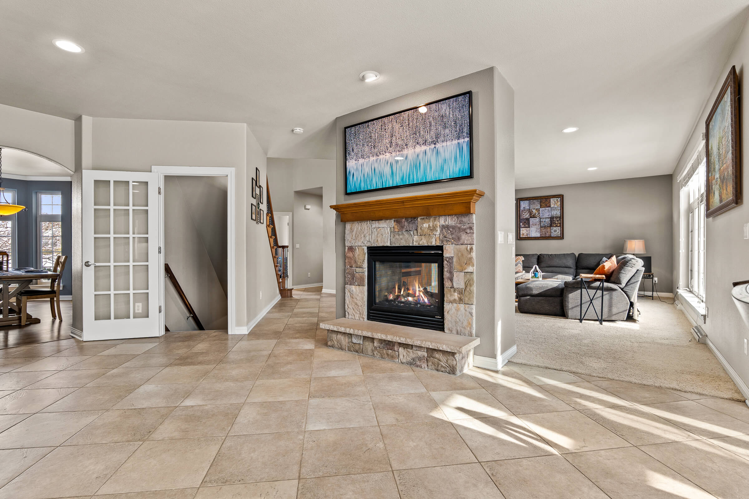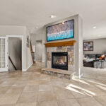The open main level is filled with natural light and showcases expansive living spaces, anchored by a stunning two sided fireplace that connects the living room and kitchen for warmth and ambiance from every angle. The kitchen is truly the heart of the home, featuring an eat in dining area, generous island seating, and easy flow into the formal dining room for hosting larger gatherings. Whether it is casual mornings or elegant dinner parties, this layout delivers.