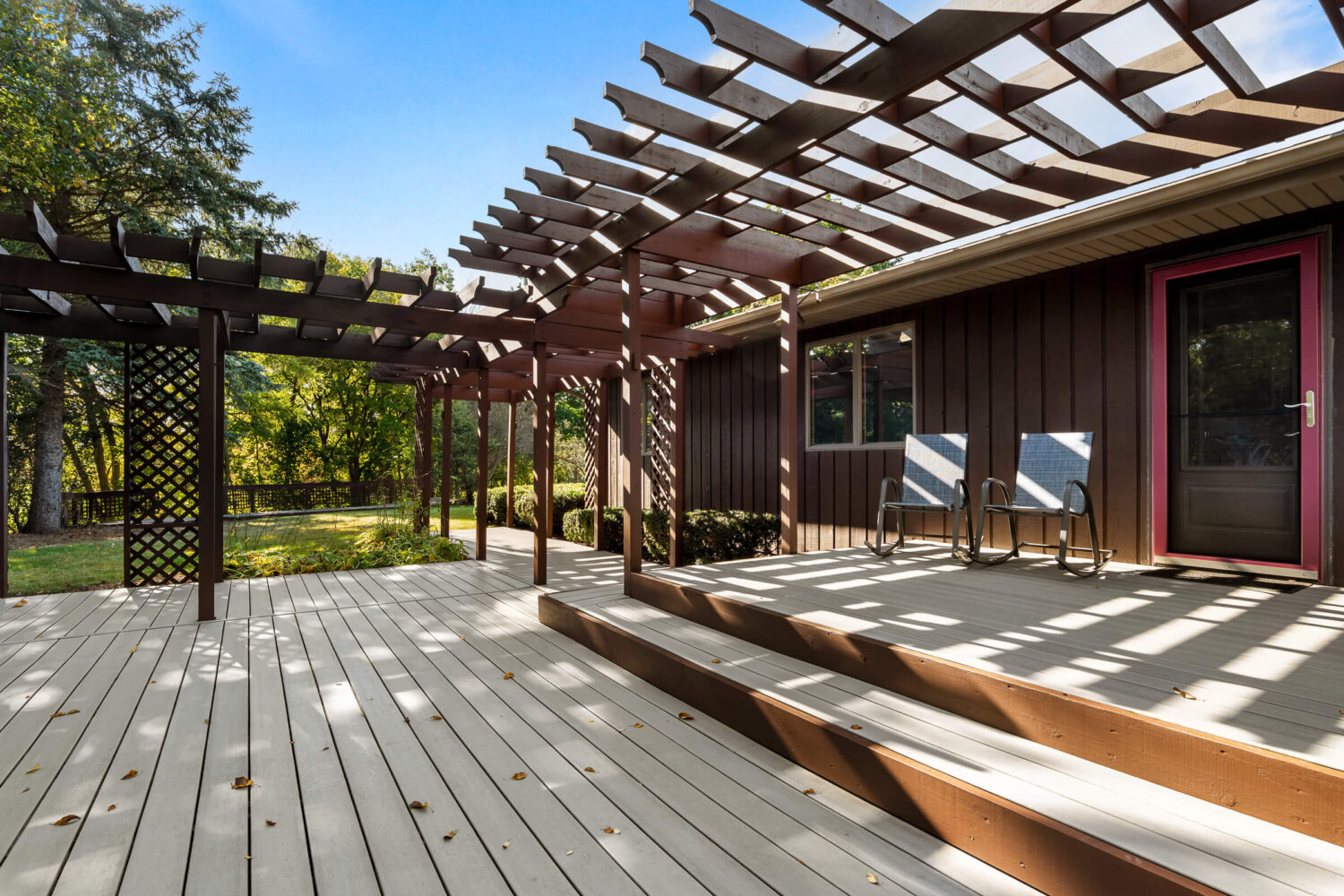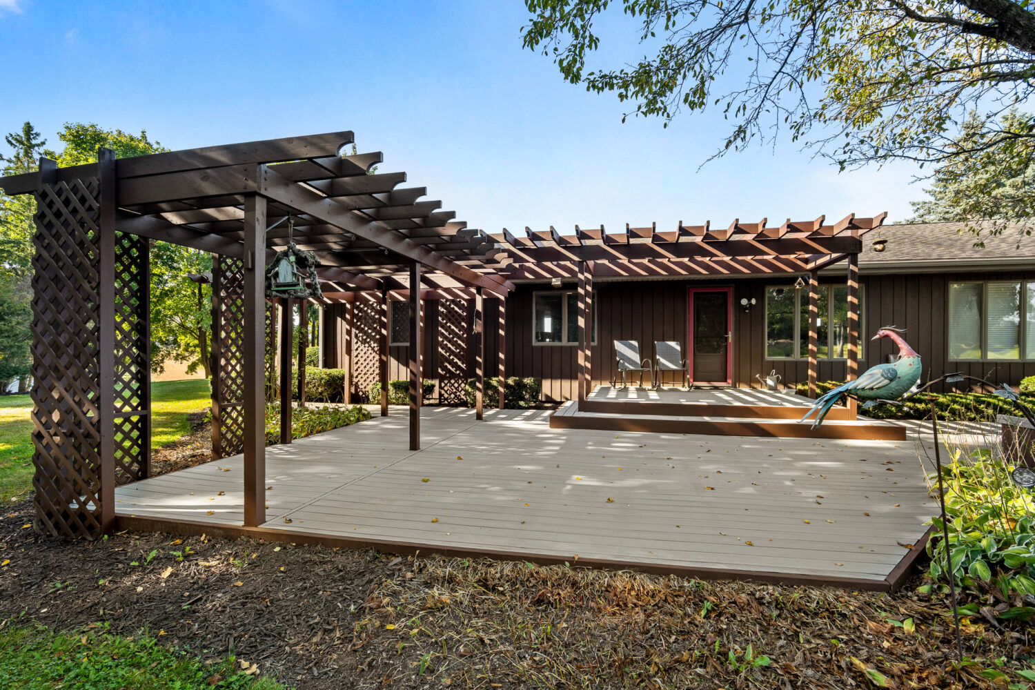Inside, the home features 3 bedrooms and 2 full baths across more than 1,800 sq ft on the main level. The spacious living room is anchored by a cozy gas fireplace, while the dining area flows to an expansive kitchen ready for your personal touches. The primary bedroom is generously sized with fresh carpet and paint (2025), offering a comfortable retreat. Patio doors lead to an impressive 1,800 sq ft deck with a pergola, perfect for outdoor dining, entertaining, or simply enjoying quiet evenings under the stars.