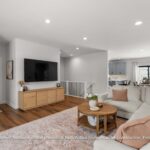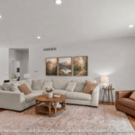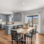 The kitchen features custom mission-style cabinetry, quartz countertops, and a functional layout that flows seamlessly into the dining and living areas—perfect for everyday living and entertaining. Durable LVP flooring runs throughout the main living spaces, with carpet in the bedrooms.