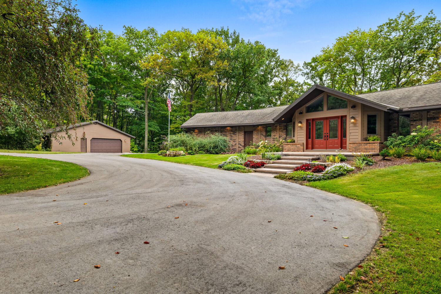 From the moment you arrive, the property makes an impression. Professional landscaping with accent lighting, a circle drive, stamped concrete front steps, and LP SmartSide siding create a welcoming approach. A freshly paved blacktop driveway and a detached heated garage with space for two or more cars or a workshop add both function and appeal. The attached two-car garage is also heated and finished with epoxy floors, providing both convenience and style.