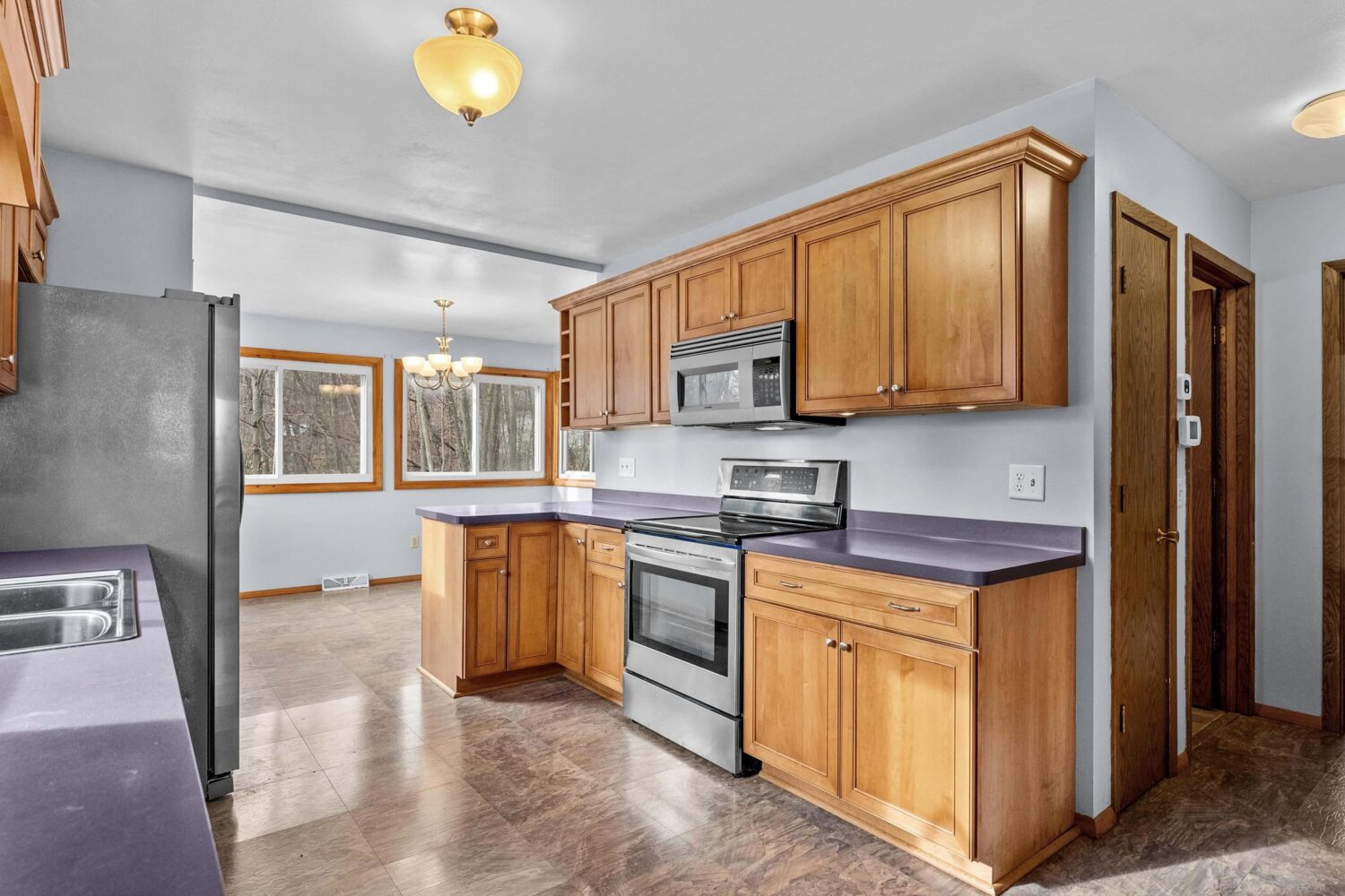 Step inside the front door to a warm and comfortable living room highlighted by a natural fireplace—an ideal place for everyday relaxation. The main level continues with a spacious kitchen and a dining area wrapped in windows that fill the space with natural light and provide beautiful views of the wooded backyard. A main-floor bedroom and full bath offer convenient living options.