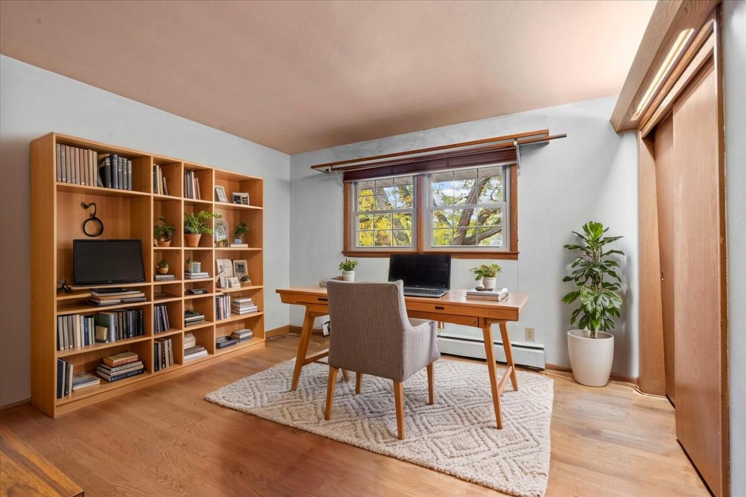 The main floor features four bedrooms, a full bath, first-floor laundry, and a spacious living room with large windows showcasing backyard views. The lower level adds even more living space with a family room anchored by a wood-burning fireplace, a bright home office with a full-size window, and a second full bath. Walk right out to the backyard from this level and take in the peaceful, private setting.
